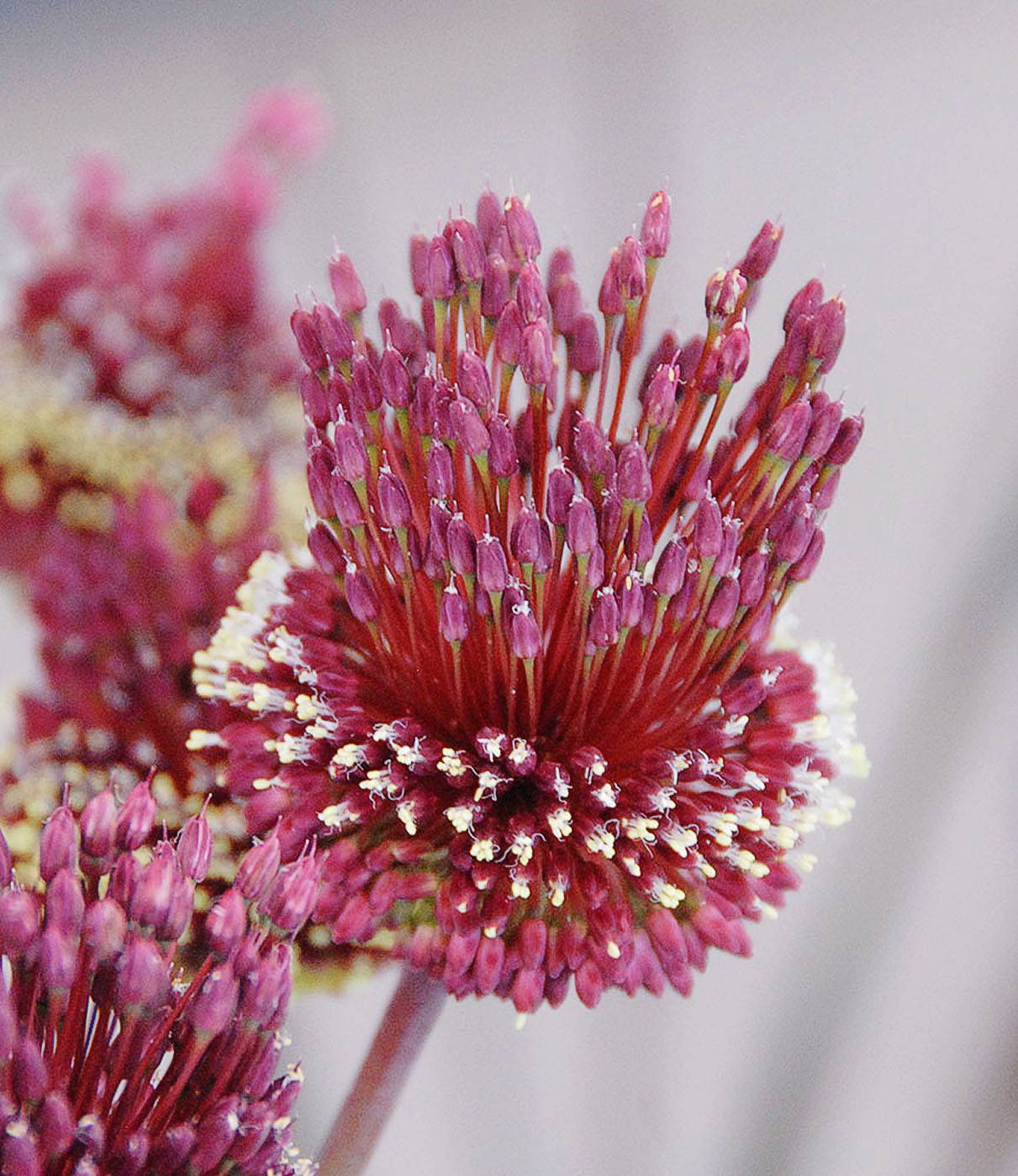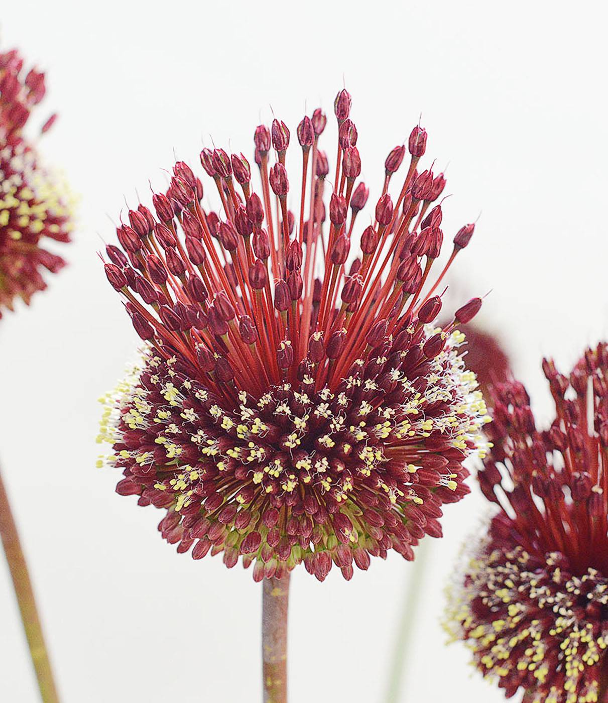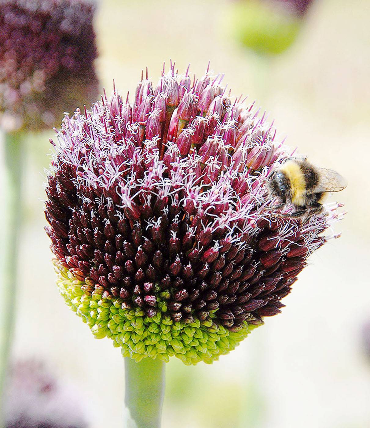 A very odd and yet wonderful type of allium with tall, narrow twisted stems carrying round, deep green 8cm flowerheads which turn to wine colour in early summer. As the blooms mature a tuft of red and white flowers rises from the top of the flower with the effect of a crazy lock of hair.