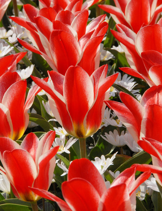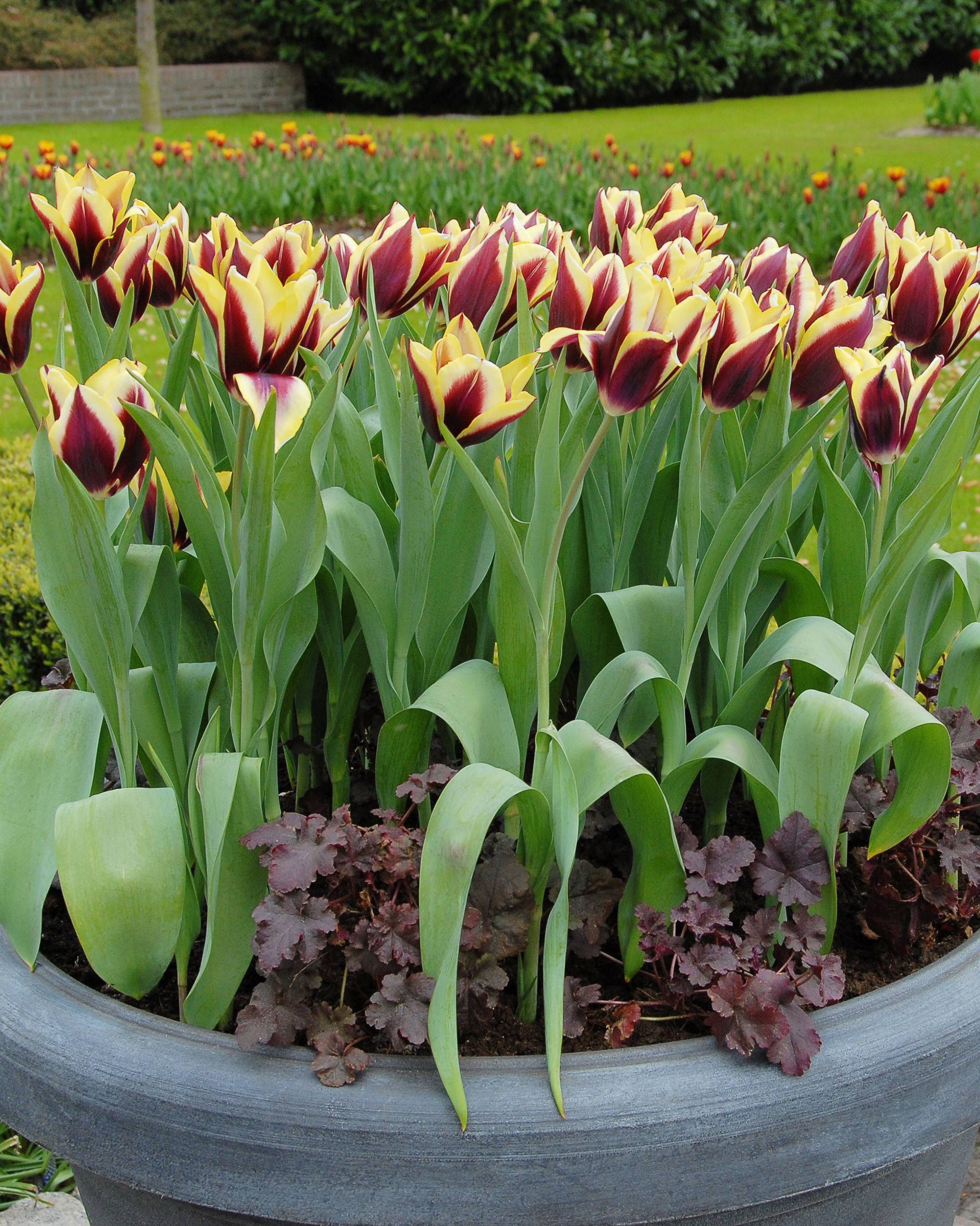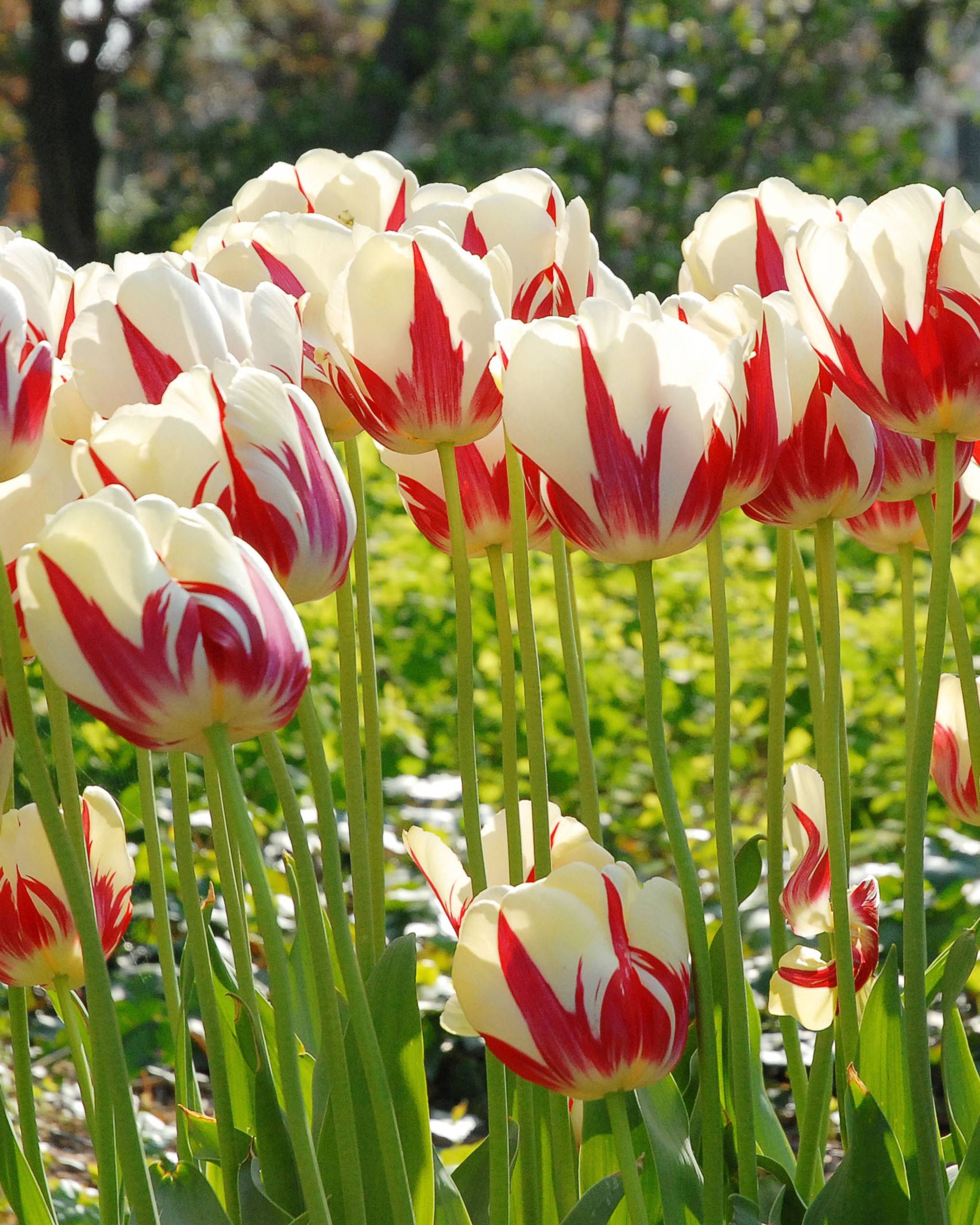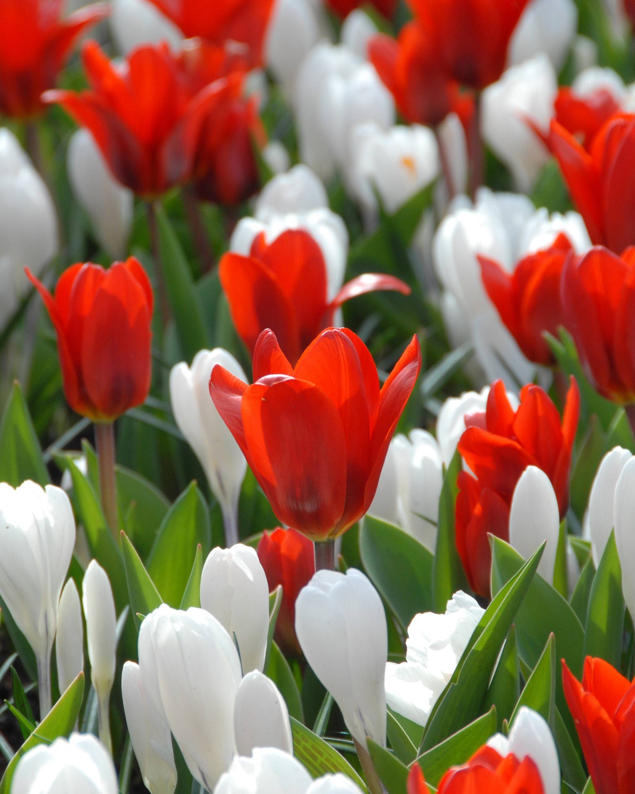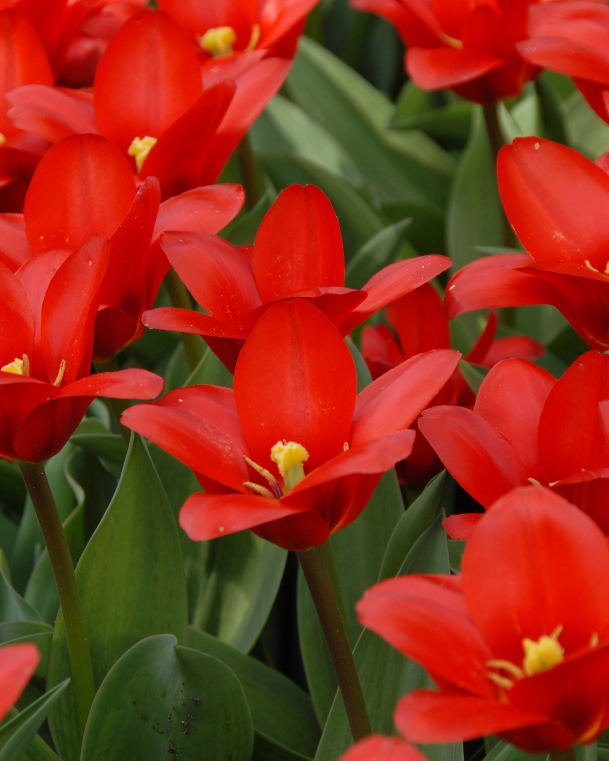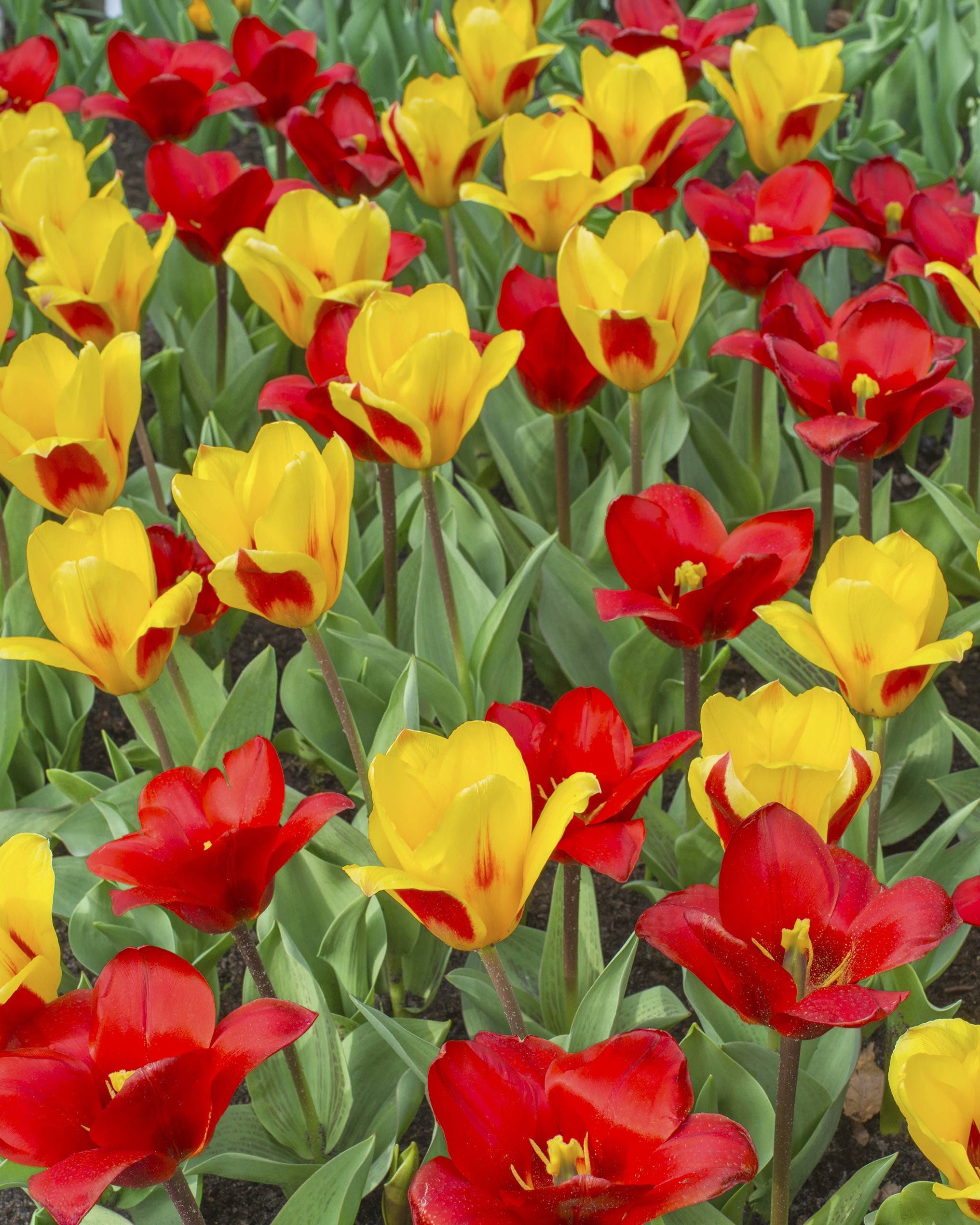 Use the startling flower colour of tulips to create a dramatic spectacle at the start of spring. Wide drifts of colour through your garden borders will lift your spirits and attract a lot of attention. As the season develops tulips of many shapes and sizes can be used to create bold, harmonious and certainly sophisticated combinations with the other plants growing in your garden. From the small-growing wild species to the colourful mid-season varieties and those that grow very tall and flower late, there are endless possibilities here to be explored by the adventurous gardener.
